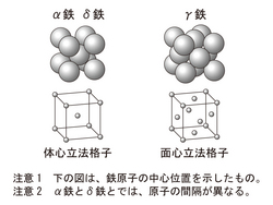 代表的な結晶構造の図を示しています。上の図でいうと、オーステナイト系ステンレス鋼は右側の面心立方格子、フェライト系は左側の体心立方格子の構造をとります。マルテンサイト系ステンレス鋼はフェライト系に近い、体心正方格子という結晶構造をとります。